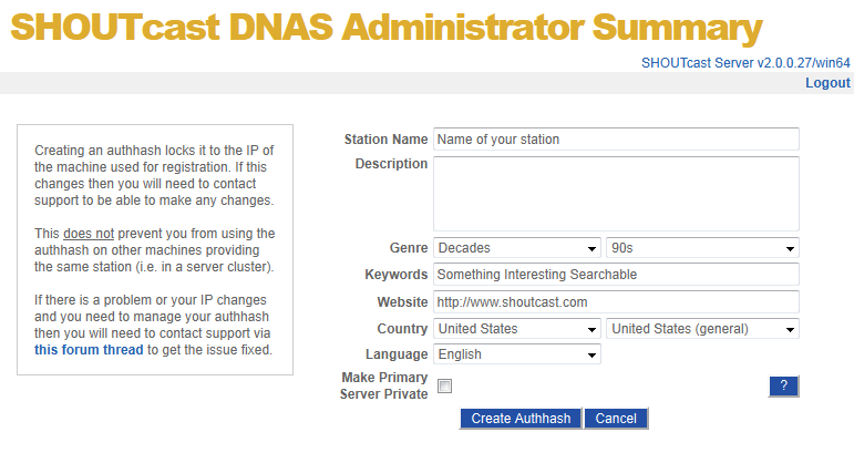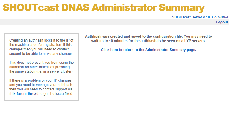 SHOUTcast DNAS Server Authhash Management