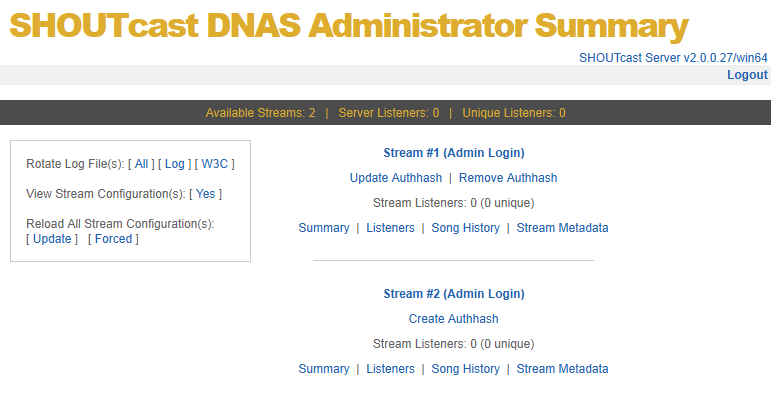 On the Administrator Summary page, you will see all streams with a source connected to them, with Create Authhash, Update Authhash and Remove Authhash options shown as appropriate beneath the stream number.