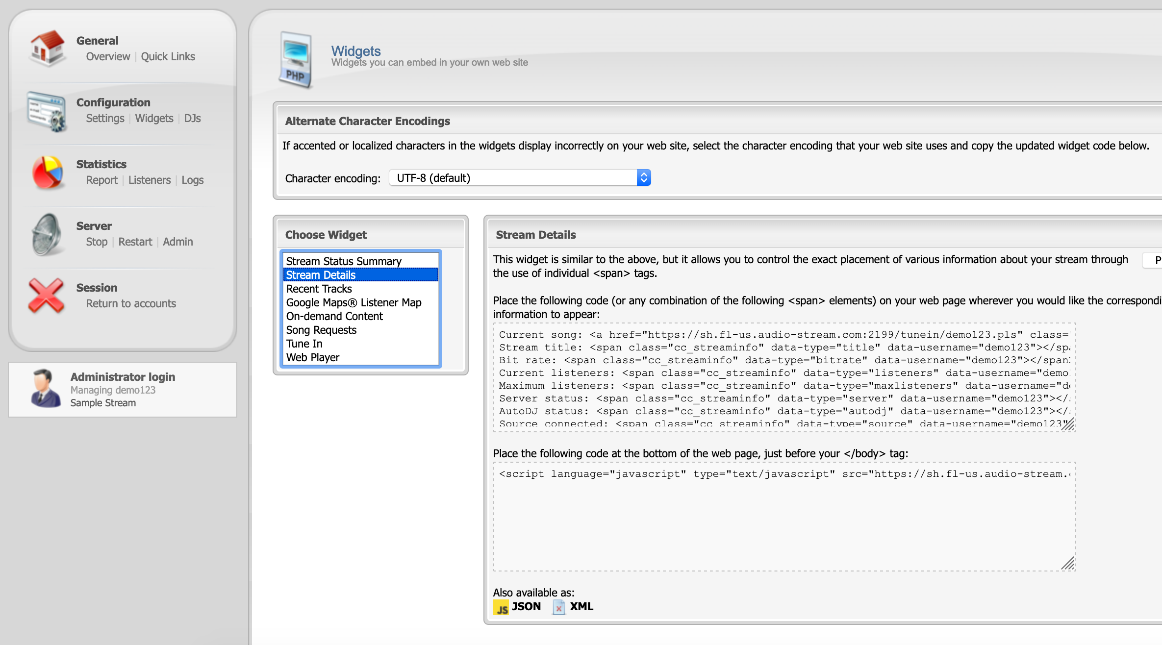 Next we complement this with the Centova Cast "Stream details" widget for in the control panel: