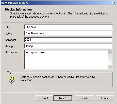 STEP 6 - Type in any information you want displayed during playback of the encoded content. Click Next (see diagram).